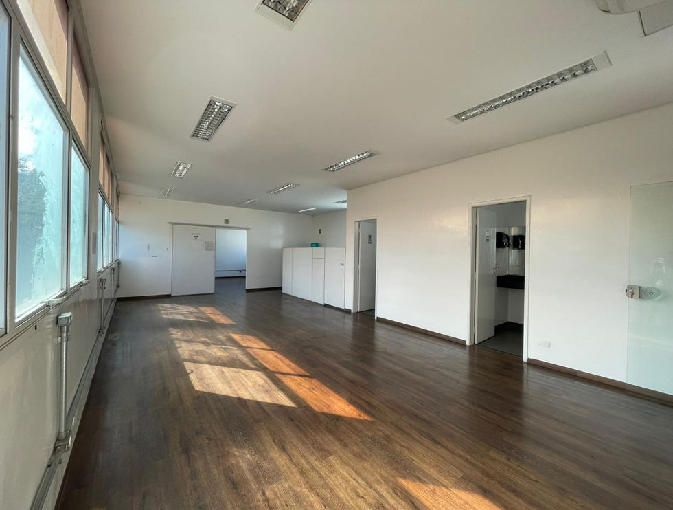 Sala entregue com iluminação, piso, ar condicionado e banheiros.