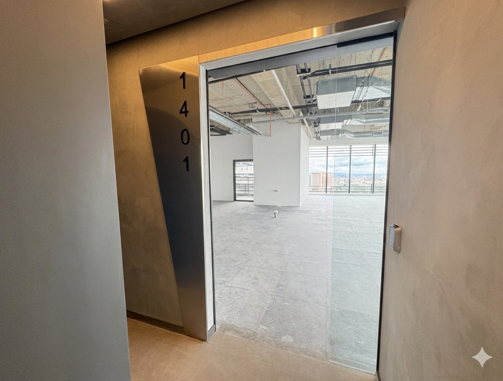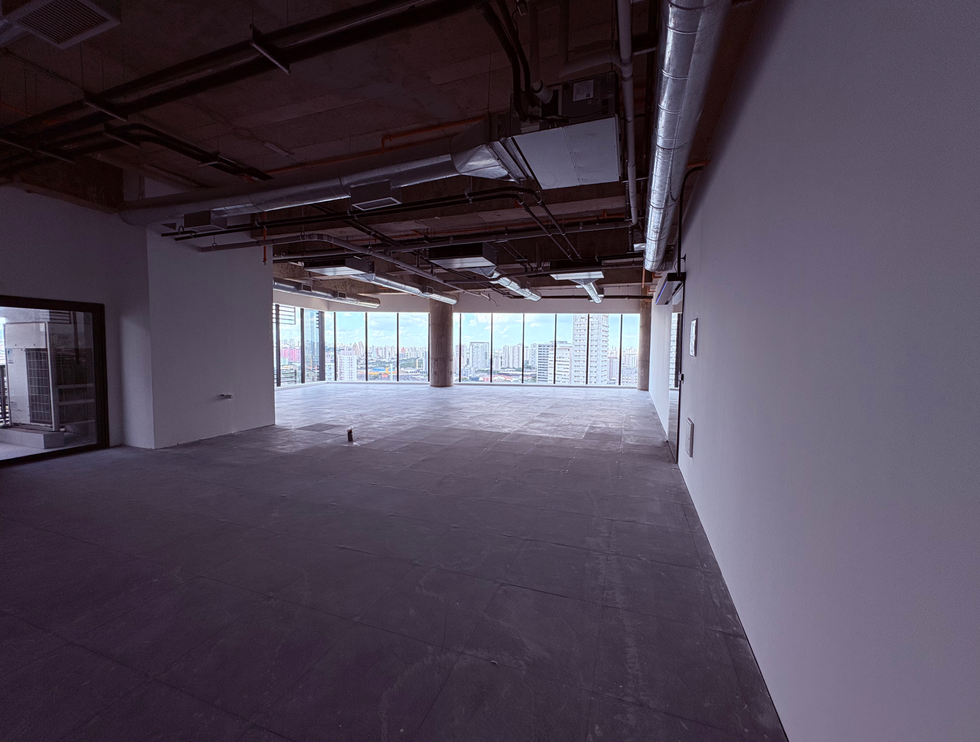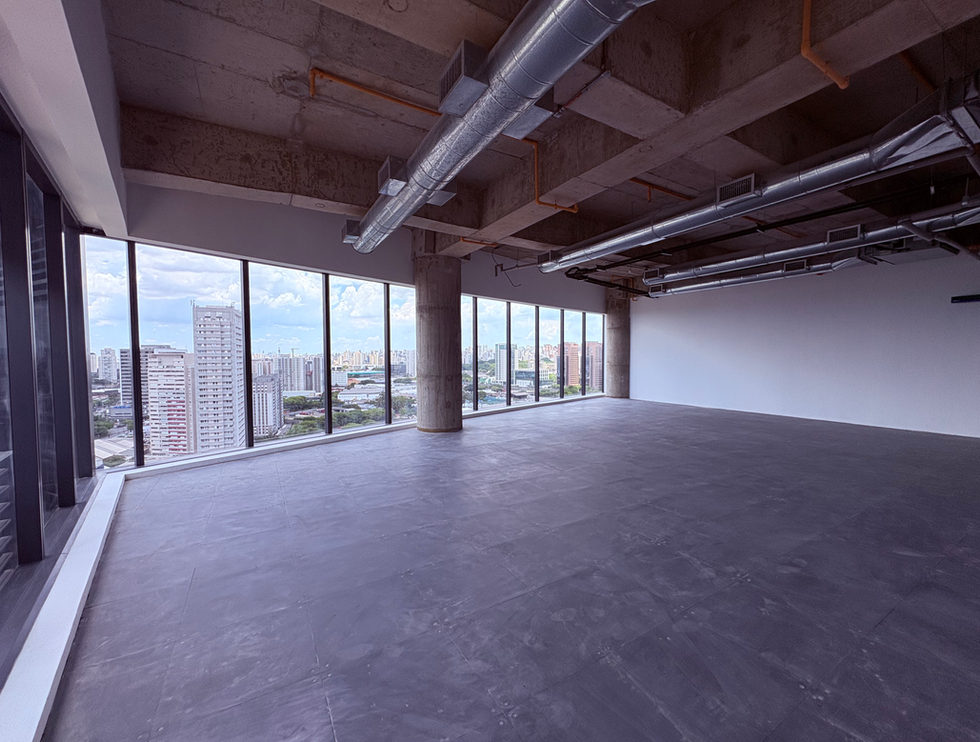 Sala de 215,93m² entregue com piso elevado, conceito open space, condicionado e estilo laje aparente, ponto de água e esgoto para copa e banheiro interno.
