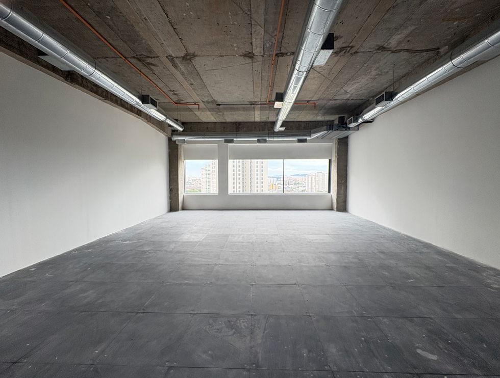 Sala de 94,17m² entregue com piso elevado, conceito open space, condicionado e estilo laje aparente.