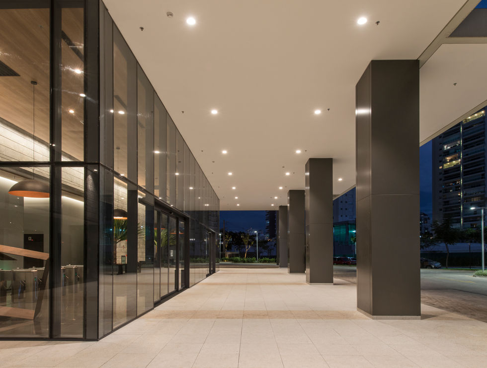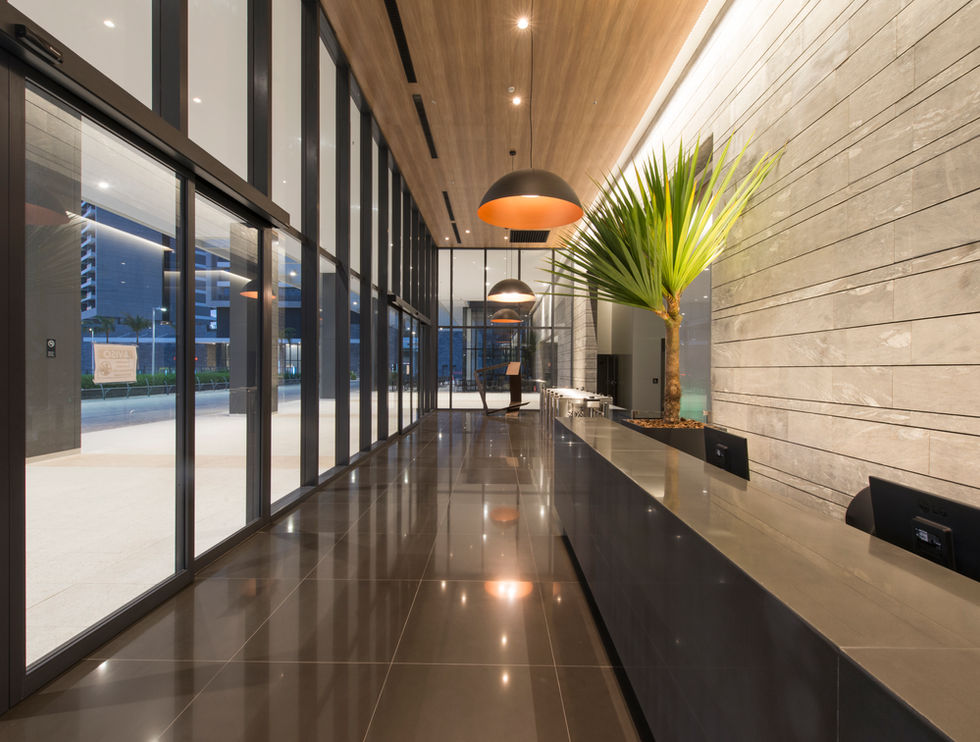 Recepção de entrada (Lobby) com acabamento de alto padrão, pé-direito 6m e controles de acesso;